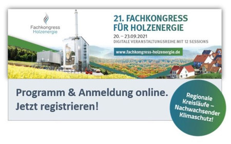 Der Fachverband Holzenergie (FVH) im BBE und die Fachagentur Nachwachsende Rohstoffe e. V. (FNR) laden am 20. bis 23. September 2021 zur Teilnahme am 21. Fachkongress Holzenergie ein.Der als digitale Veranstaltung ausgerichtete Kongress steht in diesem Jahr unter dem Motto: "Regionale Kreisläufe - Nachwachsender Klimaschutz!"
