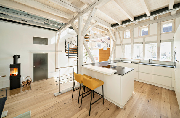 Mit der nötigen Kreativität ist es möglich, auch eine einfache Scheune zu einem außergewöhnlichen Wohnhaus mitten im Ortskern umzugestalten – wie dieses Beispiel zeigt. In dem alten Gebäude mit Holztragwerk besitzt ein Kaminfeuer besonders urtümlichen Charme. Der Ofen bietet Sicht auf das Feuer von allen Seiten.
