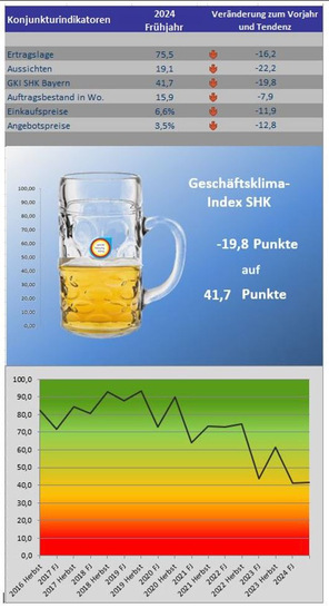 Der Grund für die erneute Abnahme des Index waren die, verglichen mit dem Vorjahr, weniger optimistischen Aussichten der bayerischen Innungsfachbetriebe für die nächsten sechs Monate (- 22,2 Prozentpunkte), welche mit einer Gewichtung von 60 % in die Berechnung des Index eingehen. Die aktuelle Ertragslage, welche 40 % des Index ausmacht, wurde ebenfalls deutlich negativ eingestuft, gegenüber dem Vorjahr nahm der Wert ab (- 16,2 Prozentpunkte).